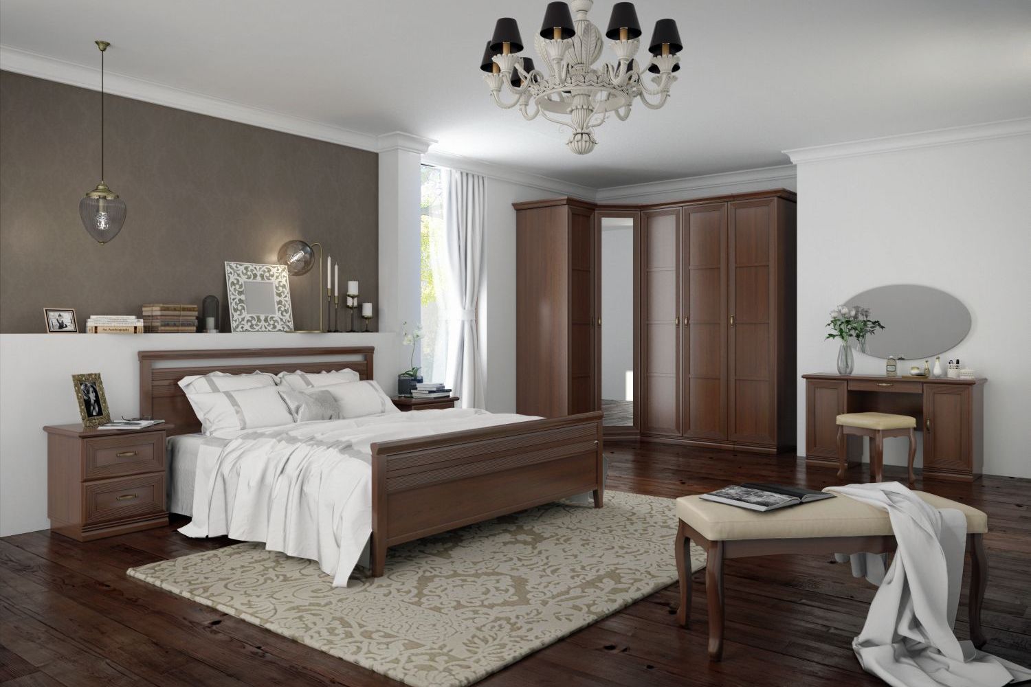 Чтобы сделать интерьер более завершенным, вы можете дополнительно приобрести металлические аксессуары в бронзовых оттенках и абстрактные постеры с яркими акцентами. Для большего удобства композицию можно завершить мягким пуфом или банкеткой в тон мебели. Не забудьте про туалетный столик, который сделает утренние и вечерние ритуалы еще приятнее.