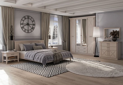 Мебель выполнена из экологичной древесной плиты. Рамочные фасады украшены стильными латунными ручками, отделанными под античную бронзу. Меблировка отличается вместительностью: два высоких шкафа с застекленным верхом, ТВ-тумба и настенные полки позволяют хранить под рукой все необходимые вещи. Бесшумную эксплуатацию обеспечивает система скрытых направляющих со встроенным демпфером и петли с доводчиками. Качественная фурнитура гарантирует надежность крепления.